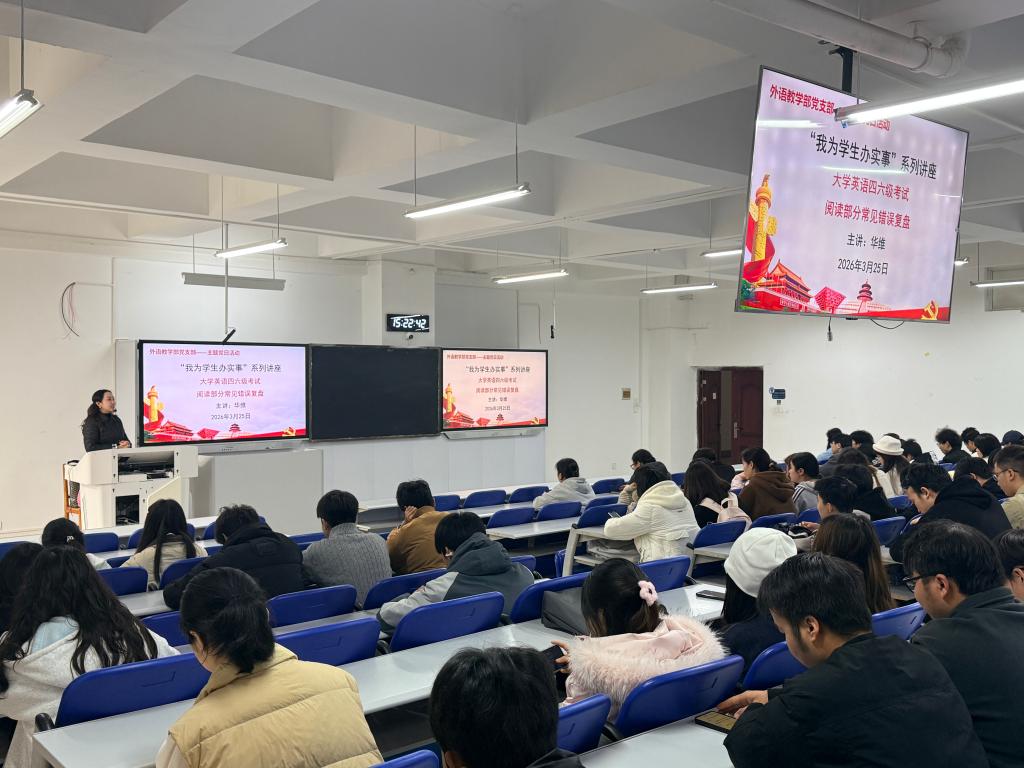 2026 年 3月 25日,人文与管理学院外语教学部党支部“我为学生办实事“系列讲座第一期,在 笃学楼1-5多媒体教室顺利开展。本次讲座由我支部华维同志面向全校各年级学生以“四六级阅读常见错误复盘:为何你总踩进同样的误区?”为题开讲。