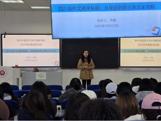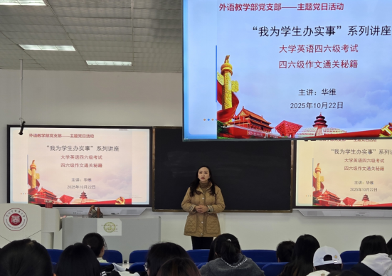 2025年10月22日,外语教学部秋季系列讲座第二期,在厚德楼5-4多媒体教室顺利开展。本次讲座由我部华维老师面向全校各年级学生开讲,讲题为“四六级作文通关秘籍:从审题到高分表达全攻略”。