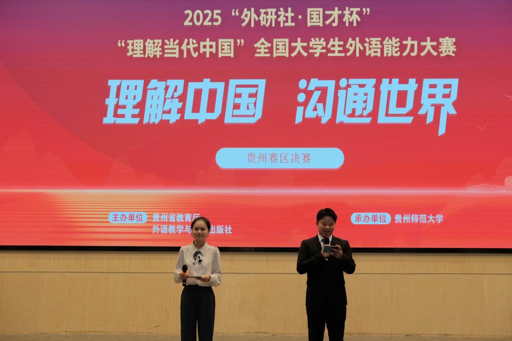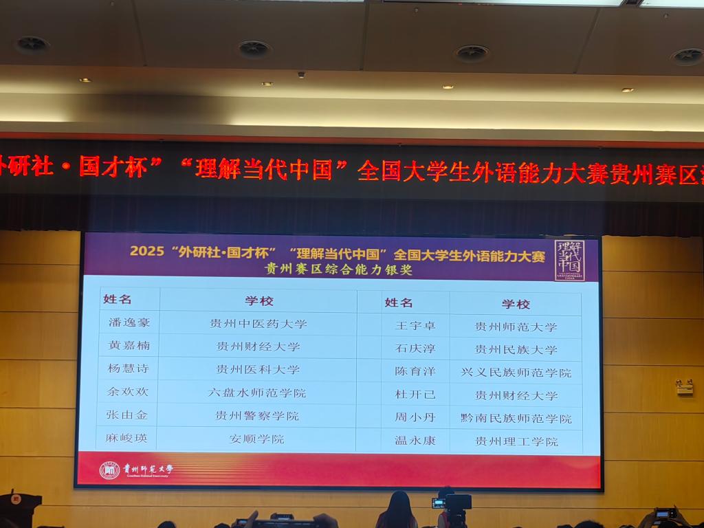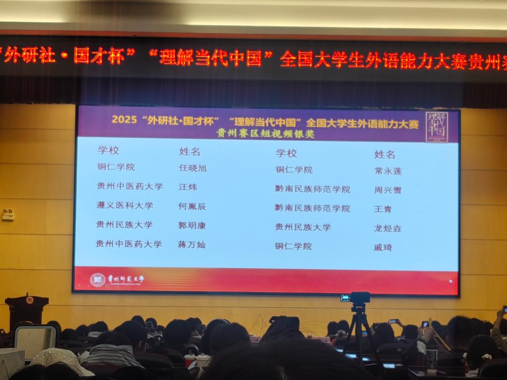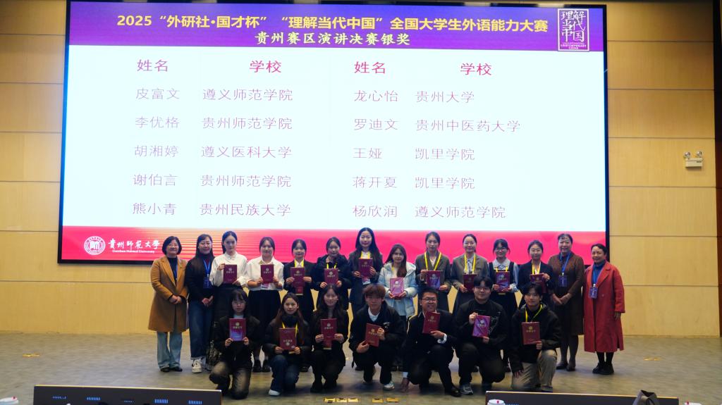 11月1日,由省教育厅和外语教学与研究出版社共同主办、贵州师范大学承办的2025“外研社・国才杯”“理解当代中国”全国大学生外语能力大赛贵州赛区总决赛圆满落幕。本次比赛吸引了全省多所高校学子同台竞技,我校积极组织参与,经过校内选拔脱颖而出的17名学生代表,在赛场上凭借专业的外语能力与灵活的应变素养,斩获4银5铜及8项优秀奖,展现了我校学子的外语素养与综合能力。